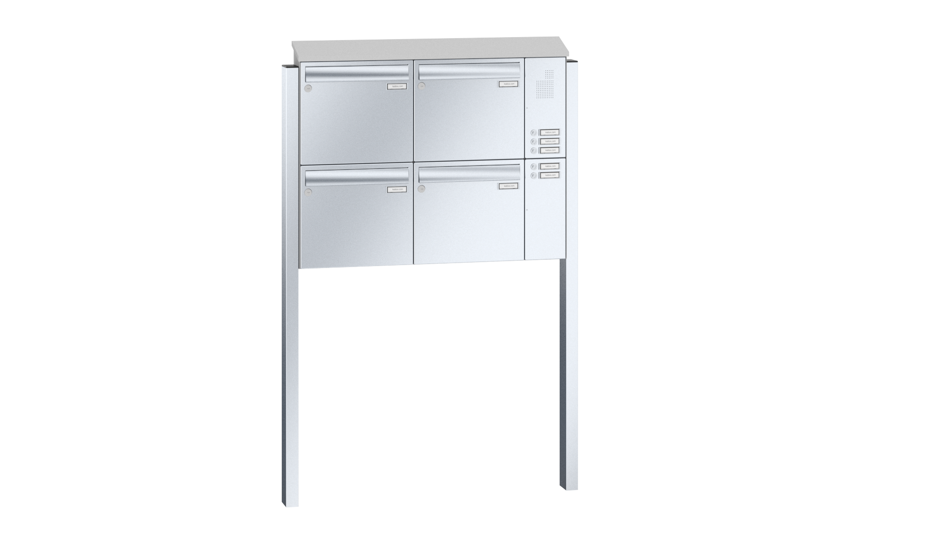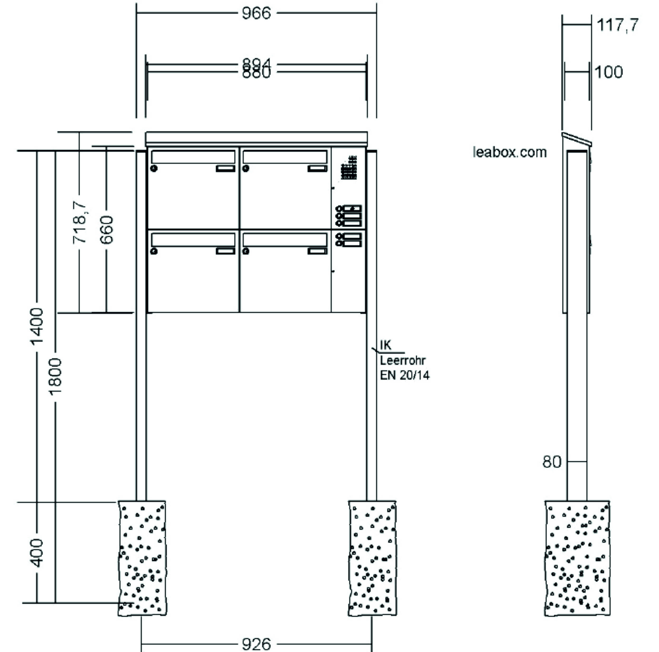 LEABOX - Edelstahl Briefkastenanlage mit LEA 20 Verkleidung inkl. Dachüberstand und rückseitiger Verkleidung und Rechteckrohrständer