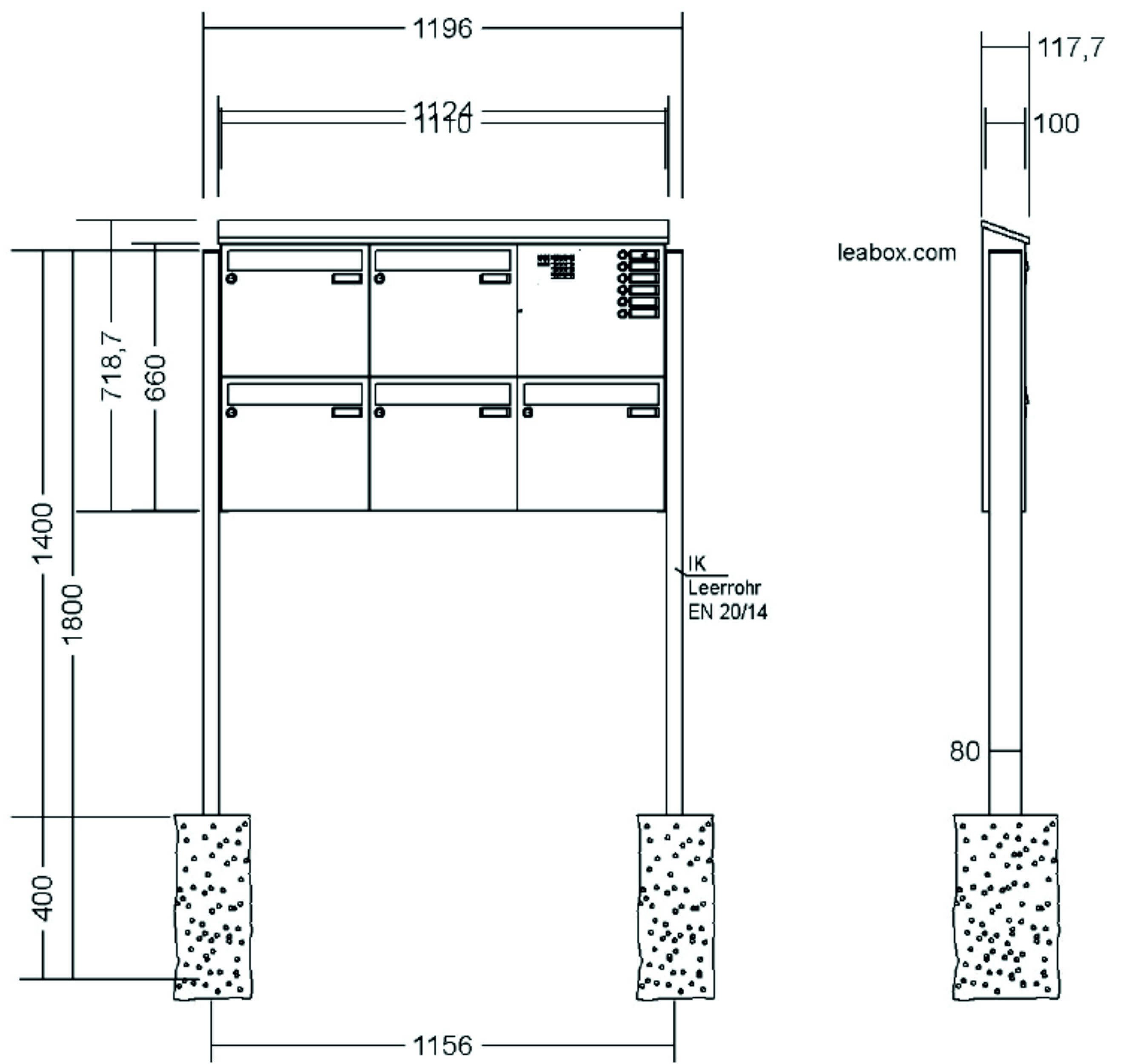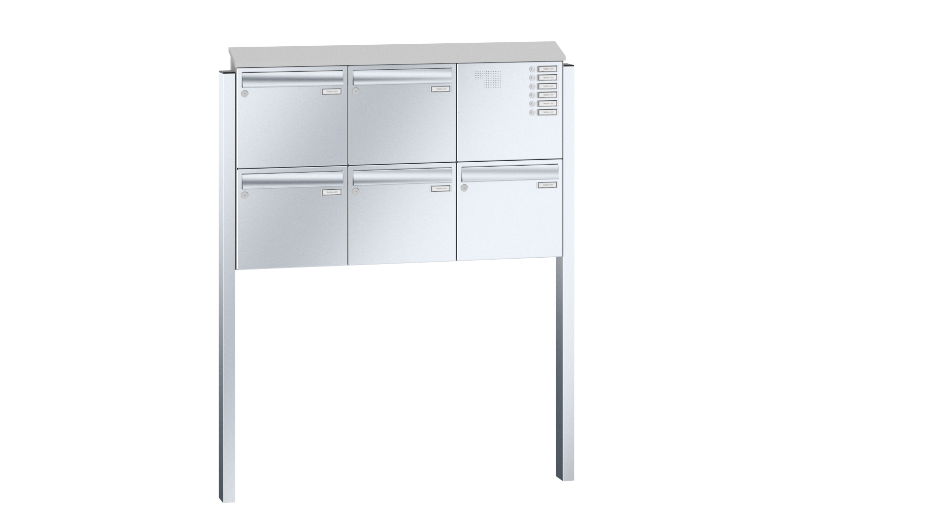 LEABOX - Edelstahl Briefkastenanlage mit LEA 20 Verkleidung inkl. Dachüberstand und rückseitiger Verkleidung und Rechteckrohrständer