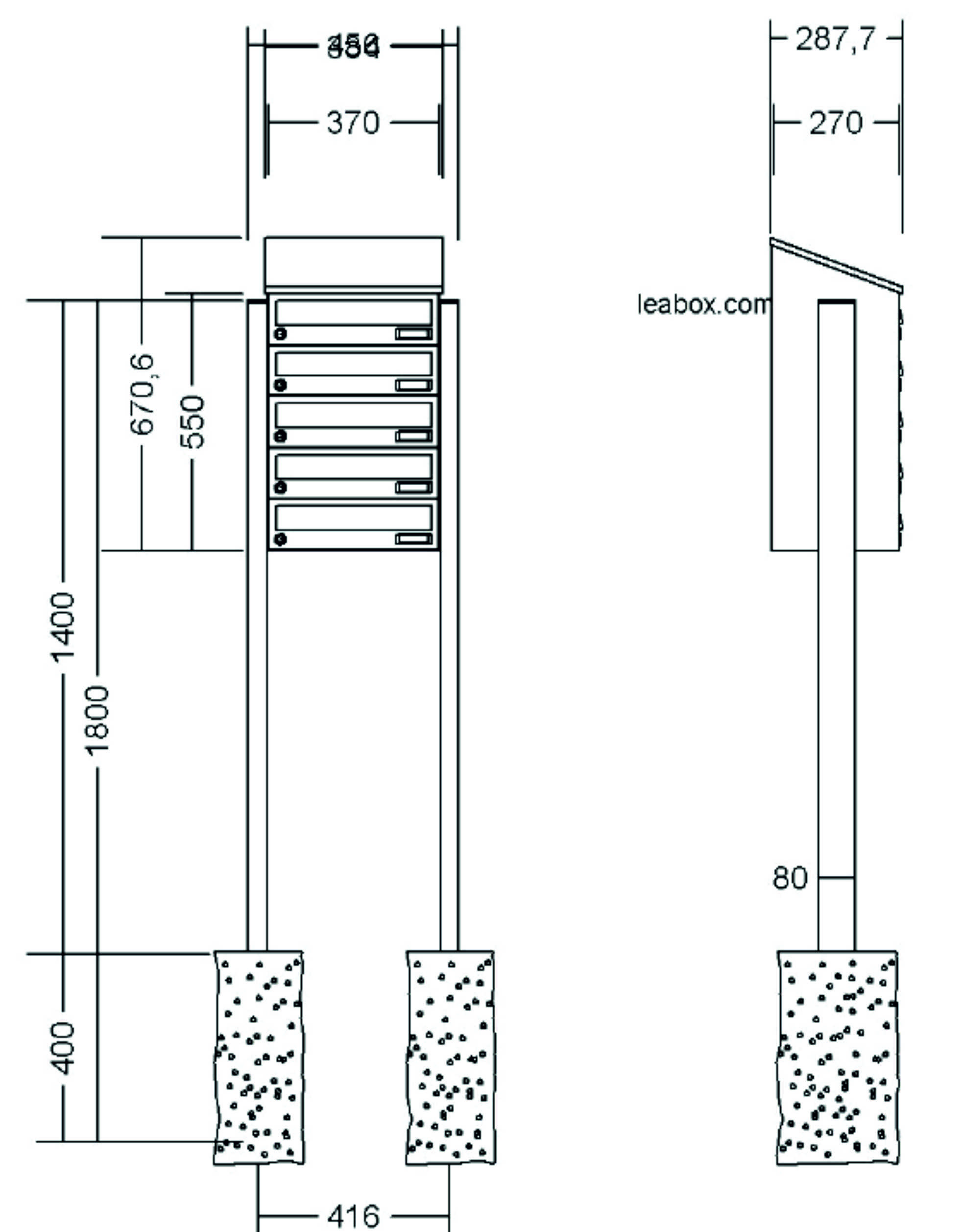 LEABOX - Edelstahl Briefkastenanlage mit LEA 20 Verkleidung inkl. Dachüberstand und rückseitiger Verkleidung und Rechteckrohrständer