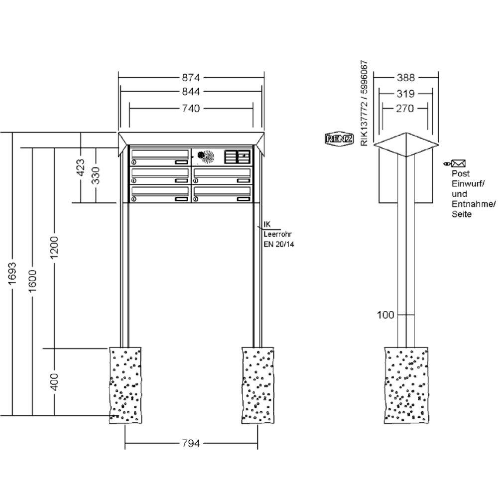 RENZ - Briefkastenanlage mit PRISMA-Verkleidungsgestell mit Regenüberstand und rückseitiger Verkleidung