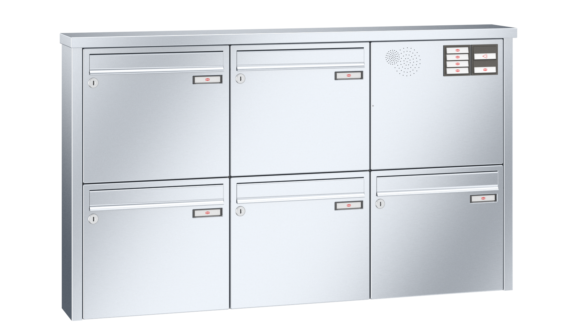 RENZ Briefkastenanlage Aufputz, Tetro, Edelstahl V4A, Kastenformat 370x330x145mm, mit Klingel - & Lichttaster und Vorbereitung Gegensprechanlage, 5-teilig