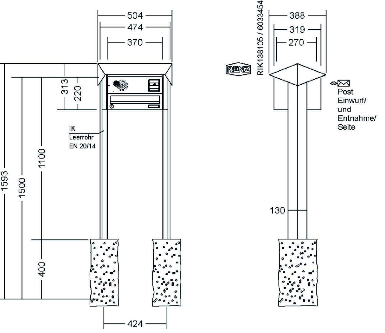 RENZ - Briefkastenanlage mit PRISMA-Verkleidungsgestell mit Regenüberstand und rückseitiger Verkleidung
